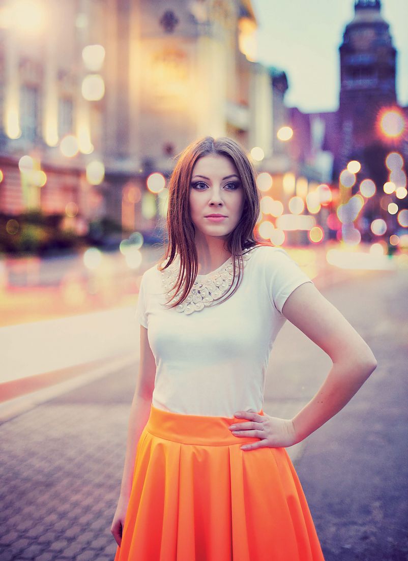 Soczyście pomarańczowa spódnica, delikatny róż dodatków i pięknie haftowane bluzki.