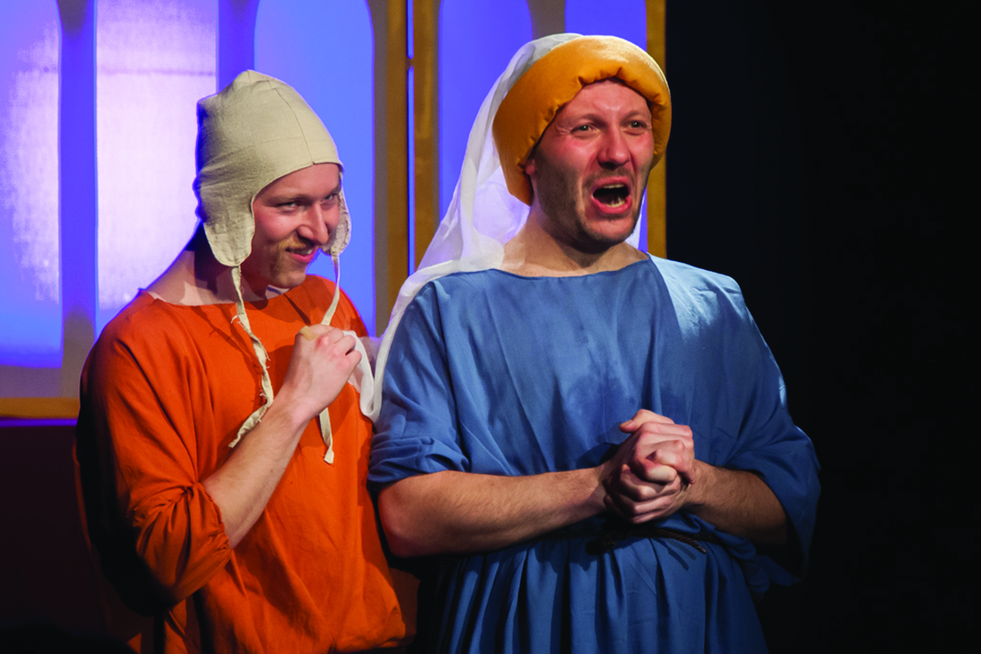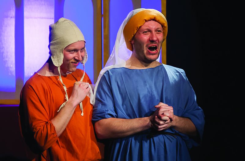 To arcyzabawne przedstawienie jest jednocześnie mariażem teatralnego warsztatu – wywodzący się z alternatywnego nurtu reżyser, pracuje tu z zawodowymi aktorami. Choć Jacewicz ma już kilkunastoletnie doświadczenie, wciąż operuje technikami przynależnymi dla off-u. To zderzenie dwóch warsztatowych światów wyraźnie widać, ale to absolutnie nie zarzut, lecz atrybut tej realizacji. Widziałem momenty, w których aktorzy zmagali się z zadaniami powierzonymi przez reżysera, ale też sytuacje dokładnie odwrotne. Świetnym i skutecznym zabiegiem było wtłoczenie weń szeroko pojętego dystansu, i to ewidentnie po obu stronach scenicznej barykady. Efektem tego pojedynku są fenomenalne role całej czwórki zespołu, którzy bawiąc się ze sobą, bawią do łez publiczność. Trzeba zobaczyć rozkapryszoną i momentami słodko wkurzoną księżną Magdaleny Stachowskiej–Wrani. Pokładałem się ze śmiechu przy werbalnych zmaganiach Adama Kuzycza–Berezowskiego, czy mistrzowskich, teatralnie wręcz akrobatycznych, popisach Rafała Hajdukiewicza. Nie zawiódł także Maciej Sikorski, nagrodzony w grudniu ubiegłego roku „Srebną Ostrogą” w konkursie „Bursztynowy Pierścień”. Co ciekawe, obaj panowie są świeżo po rolach w pleciugowym „Disco macabre”, do którego zapuścili gustowne wąsiki, które świetnie wpisały się także w tę, osadzoną w średniowiecznych realiach, produkcję. Wspomniany wcześniej dystans dotyczy niemal każdego aspektu tej realizacji – twórcy puszczają do widzów oko, ale nie czynią z tego absolutnie żadnej tajemnicy. I konwencja spektaklu i krój ról, pozwalają nawet na pełnoprawne „zgotowanie się” aktorów oraz sporą dozę improwizacji, także z udziałem publiczności, która także ma w spektaklu do odegrania pewną rolę. Oryginalnie rozplanowano układ niewielkiej przestrzeni zamkowego teatru, wykorzystując każdy jej zakamarek – nieożywiony i ożywiony (kreacje akustyka i oświetleniowca). Aktorzy grają między publicznością, i z publicznością. Ta bliskość likwiduje (znów to określenie) dystans między sceną a widownią. Ciekawie wypada warstwa muzyczna, konsultowana z Lesją Szulc. W spektaklu usłyszymy wiele gatunków muzycznych, z tak uwielbianym przez Jacewicza i jego Teatrem Brama, archaicznym, białym śpiewem. Kostiumy Sylwii Kaźmierzowskiej nawiązują do czasu akcji, ale w pewnych scenach w których aktorzy wyraźnie zmagają się z materią (materiałem?), także do wszędobylskiego dystansu. Michał Banasik ograniczył scenografię do minimum, której głównym elementem jest tryptykowy ołtarz, w którego skrzydłach wyświetlane są animacje inspirowane oryginalnymi „Bardzo bogatymi godzinkami księcia de Berry”. Jeśli miałbym wytknąć nieudane pomysły, to mimo osobistego zaangażowania w aktualną politykę, nie uważam, by tak nachalne i jednoznaczne jej uprawianie służyło produkcji. Nie zaprzeczam, polityczne odniesienia ubawiły mnie bezgranicznie, ale wyraźnie gryzą się z atmosferą spektaklu i jego głównym przesłaniem.