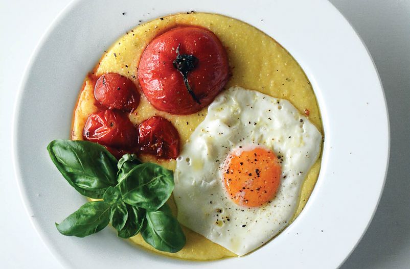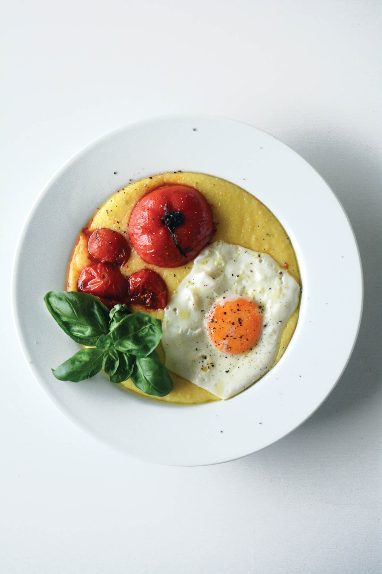 Ciepły poranek. Serowa polenta ze smażonymi pomidorami, jajkiem i bazylią
