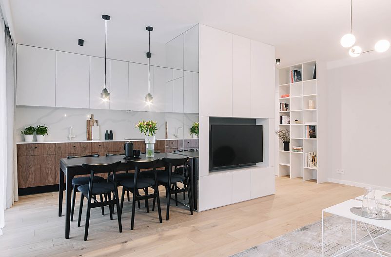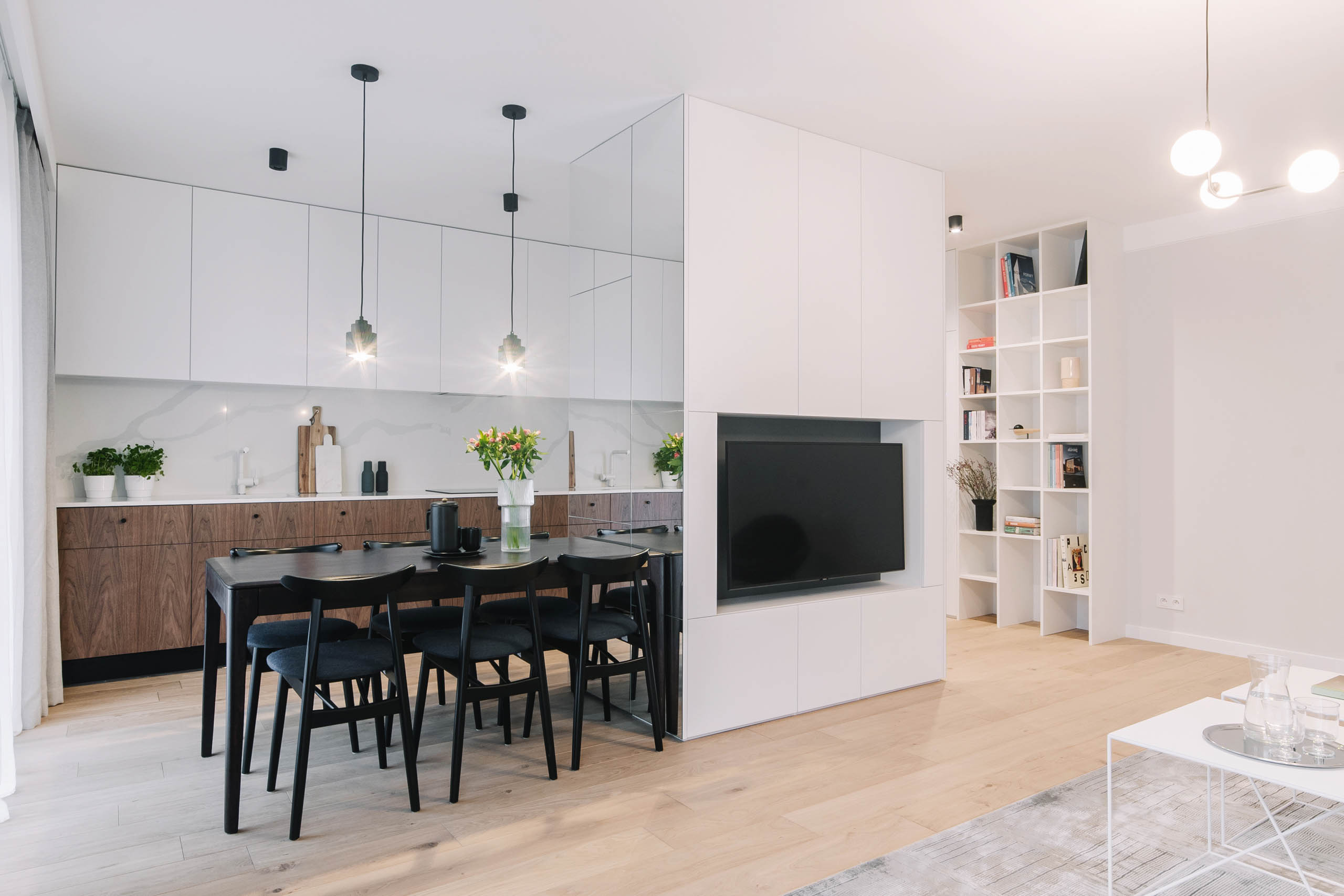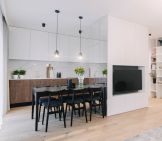 – Chcieliśmy stworzyć ponadczasowe wnętrze, które przyszły nabywca w prosty sposób dostosuje do indywidualnych potrzeb. W projekcie zastosowano naturalne materiały takie jak drewno i kamień. Dominują neutralne barwy, charakteru dodają czarne dodatki. W przedpokoju, pokojach i łazience zaprojektowaliśmy obszerne szafy, dzięki temu wnętrze jest nie tylko eleganckie, ale również funkcjonalne – dopowiada projektantka Hanna Mackiewicz.