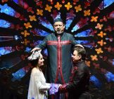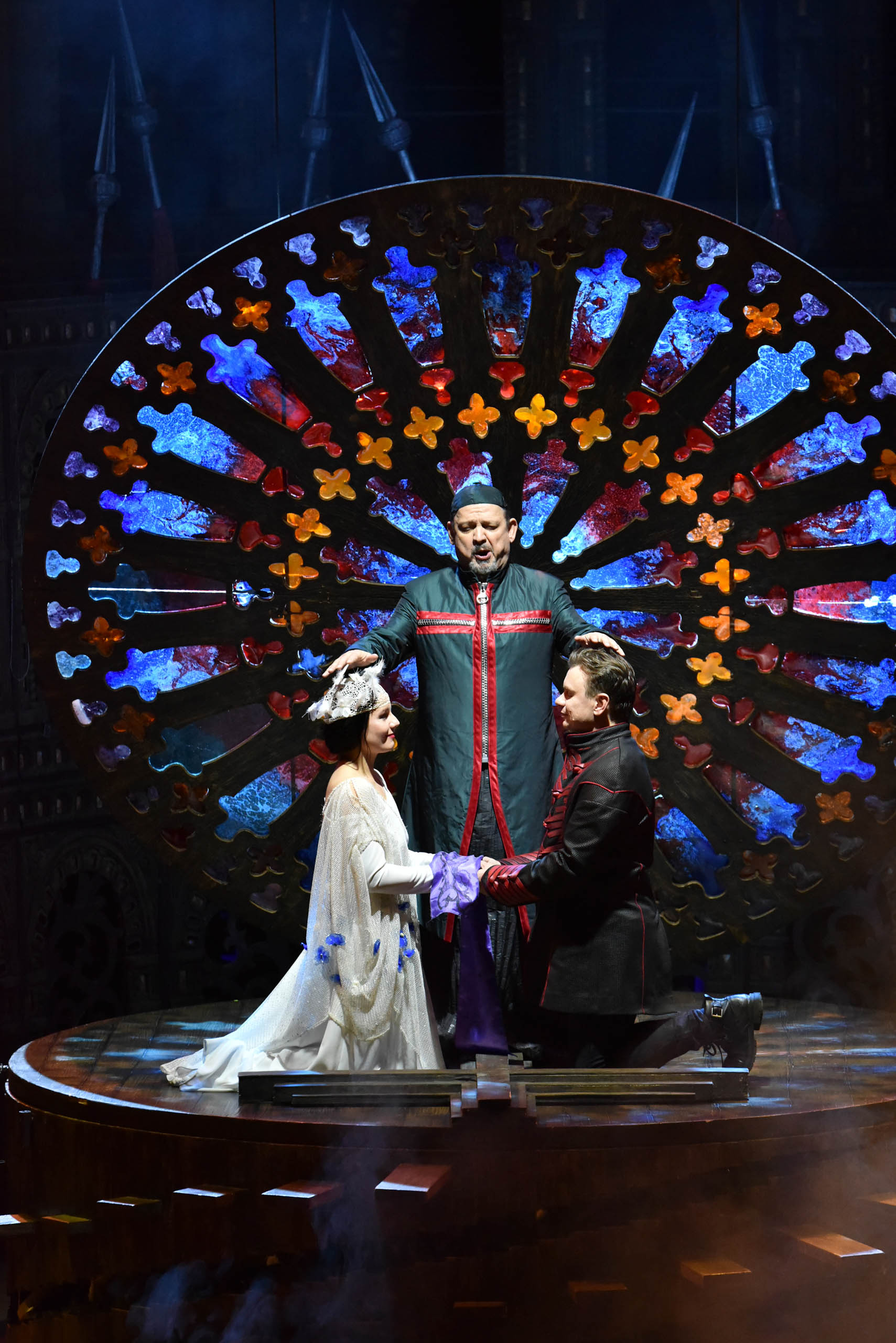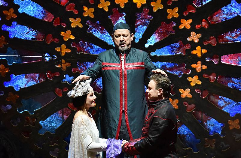 Reżyser Michał Znaniecki kluczem do swojej (oraz autorów libretta) operowej interpretacji nieśmiertelnego dramatu Szekspira czyni formułę teatru w teatrze. W pierwszej scenie chór zapowiada, że będziemy świadkami właśnie inscenizacji… Tworzy tym samym symboliczny dystans i pozostawia pewien interpretacyjny margines, który na miłosną historię pozwala spojrzeć z szerszej perspektywy, także tej aktualnej vel politycznej. O teatralizacji do kwadratu świadczy także monumentalna scenografia Luigi Scoglio: to kilkupiętrowa konstrukcja o misternych zdobieniach i efektownej iluminacji. Jedni widzą w niej antyczny amfiteatr, inni ociekające krwią Koloseum, a jeszcze inni wnętrze teatru elżbietańskiego. A może to cerkiewny ikonostas, nadający scenom prowadzonym na owalnym podeście sakralnego charakteru – ołtarz miłości vs. ołtarz ofiarny. Żartobliwa interpretacja zasłyszana podczas premiery, kierowała jeszcze skojarzenie na kolumnadę z czołówki „Muppet Show”, co pierwotnie wydawało się niepoważne, lecz po namyśle… całkiem trafne. Szczególnie w odniesieniu do uniwersalnych znaczeń dramatu Szekspira i ich współczesnego rozumienia.