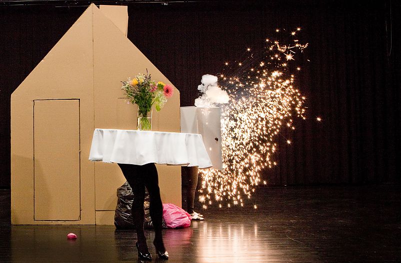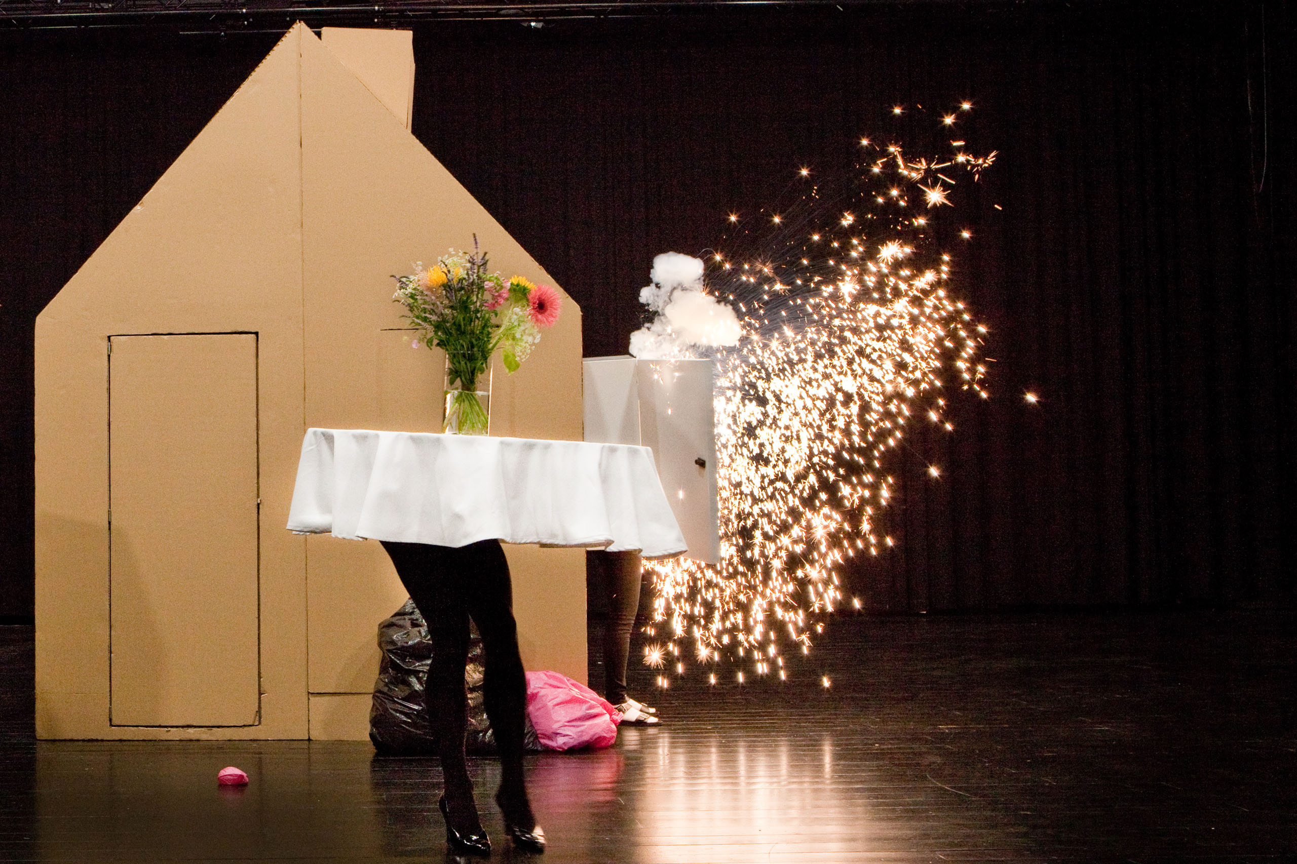 Komiks o tragicznej porażce społeczności, który ożywa za sprawą chodzącego stołu, chatki wypuszczającej barwne dymy i sfrustrowanej skrzynki bezpiecznikowej. Wybuchowa narracja rozgrywa się wokół dymiącego kolorowo domku z tektury, jego mieszkańców i sąsiadów: eleganckiego chodzącego stołu, który pragnie jedynie, aby go nakryto, mężczyzny, który chce wynieść śmieci, sfrustrowanej skrzynki bezpiecznikowej oraz bardzo długiej pary spodni. Przeżywają duże i małe dramaty, które mają slapstickowy charakter, choć mogą prowadzić do katastrofy. Tragiczna historia upadłej społeczności opowiedziana jest z komiksową lekkością. Spektakl dla młodzieży i dorosłych 14+.
