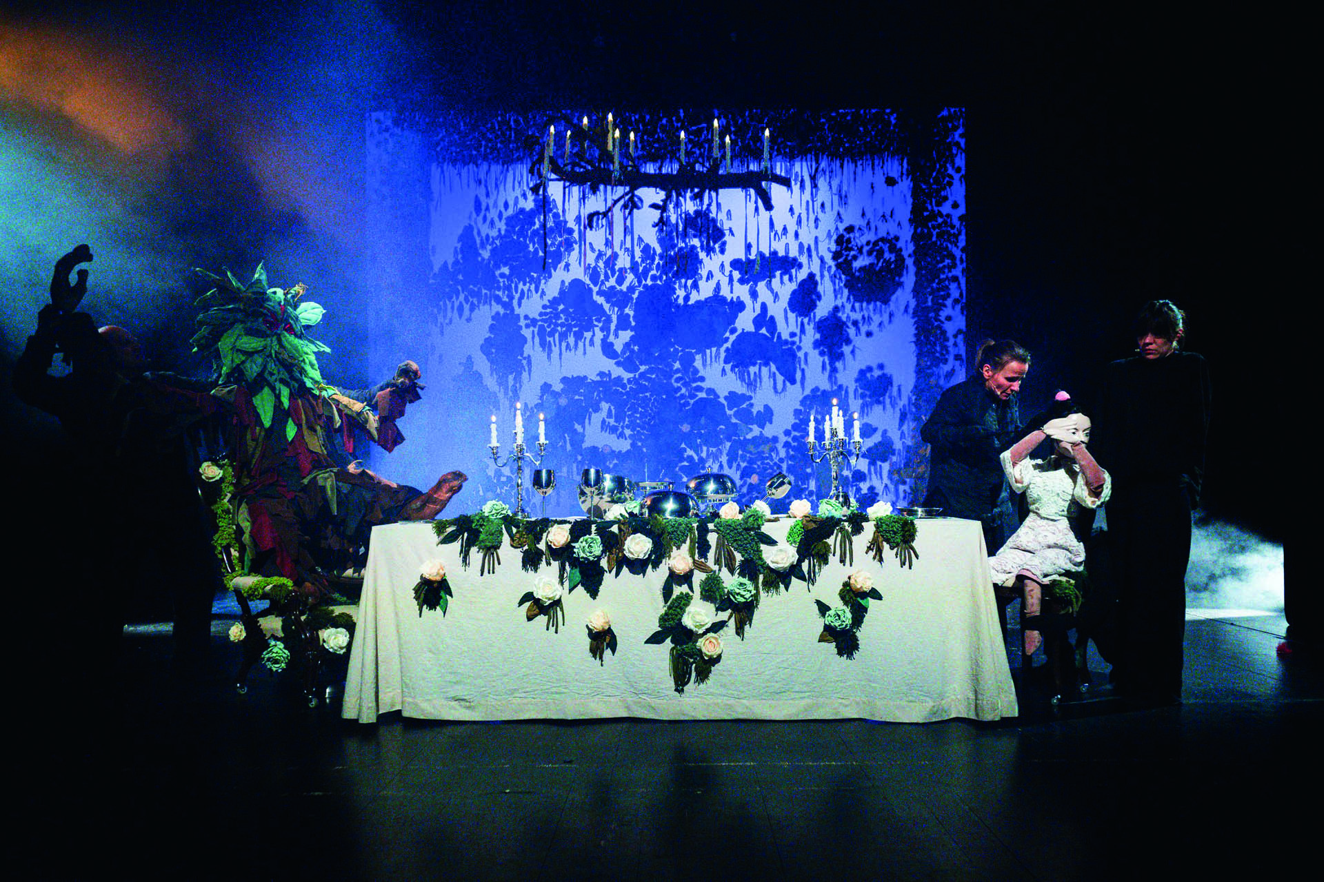 Na osobną uwagę zasługują lalki inspirowane japońską techniką Bunraku autorstwa Márii Bačovej. Spore figury (2/3 ludzkiej postaci) zachwycały misternością wykonania oraz kostiumami (znów Brudnicka). Intrygowała forma, ale również sposoby animacji. Duże lalki prowadziły aż trzy osoby. Obok głównych bohaterów widzieliśmy także rozmaite strachy (wilki albo diabły), nietoperze czy wróżkę. Te figury znajdowały się na długich sprężystych kijach (à la wędki). Ich powietrzne akrobatyka przydawała spektaklowi nie tylko urody, ale też pewnej magii czy baśniowości.
