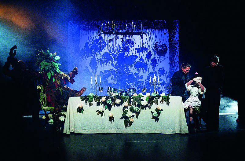 Spektakl urzeka… malarskością. Co ciekawe efekty wizualne reżyser osiągnął przy zaskakująco skromnych środkach i kreatywnym wykorzystaniu podstawowych funkcji parku technicznego teatru. Tło akcji stanowiły dwa ogrody – w domu Belli oraz w zamku Bestii. Symbolizowały je opuszczane na sztankietach ażurowe tkaniny, w które wkomponowano roślinne motywy. Całość nawiązywała do monumentalnego malarstwa barokowego, widać też było inspiracje martwymi naturami znanymi z płócien artystów flamandzkich czy holenderskich. Piękny jest kipiący zdobną zastawą stół w zamku Bestii, jakby wyjęty z XVI-wiecznych obrazów. Autorką scenografii jest Ewelina Brudnicka. Brawo!