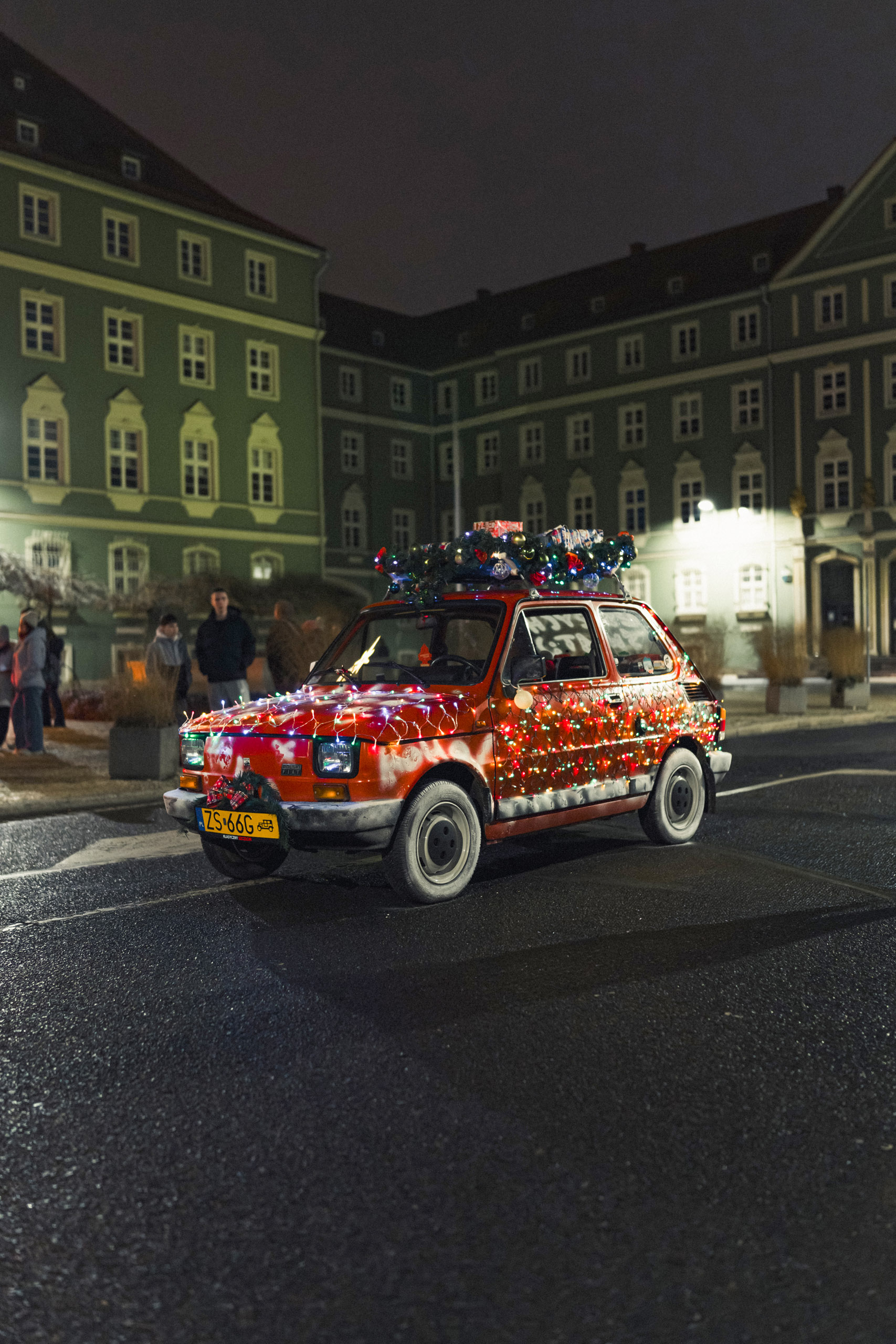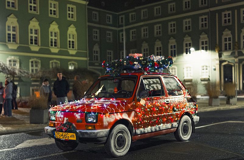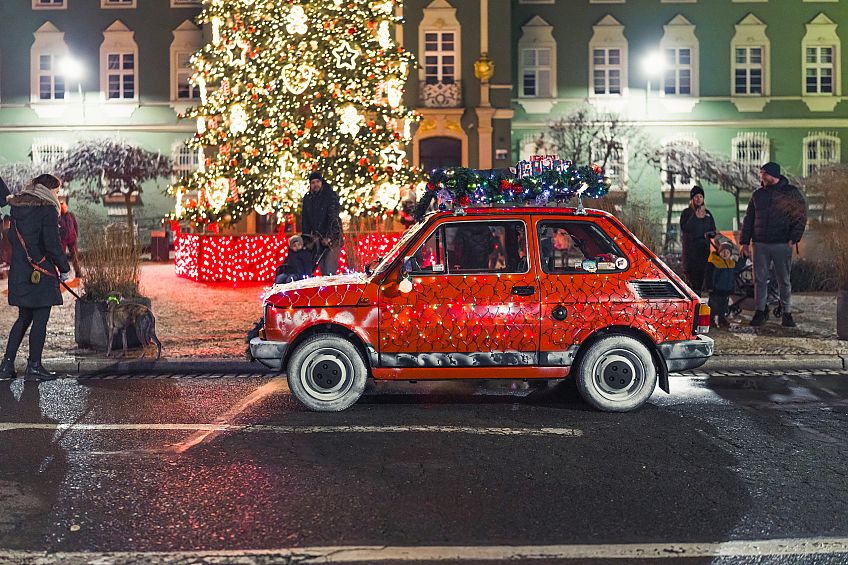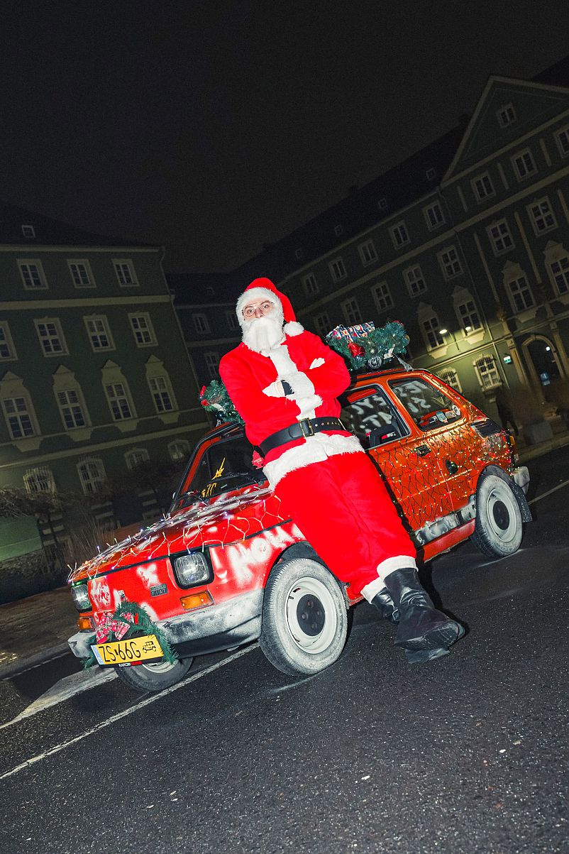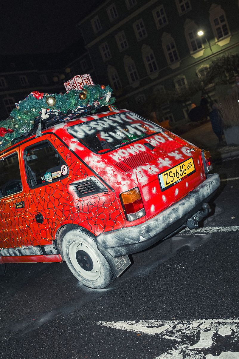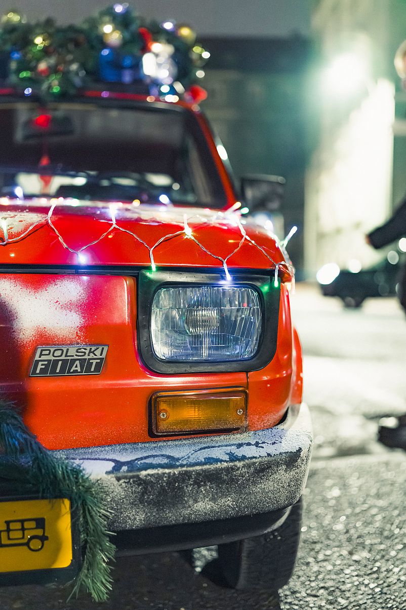 Trzeba przyznać, że czerwony Maluch okraszony w dodatku świątecznymi lampkami pasuje