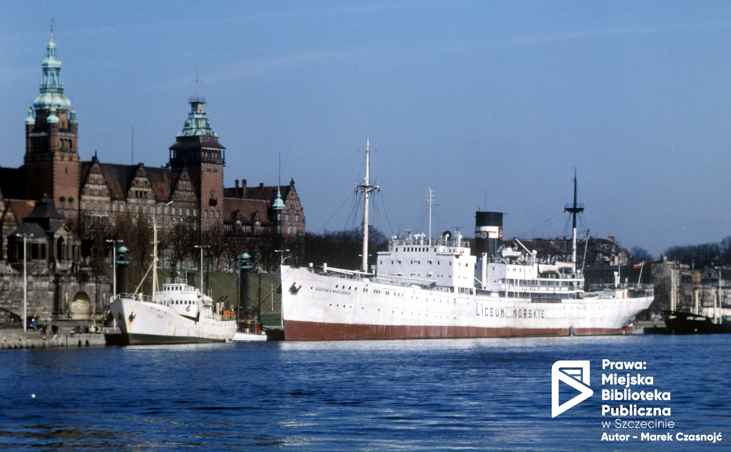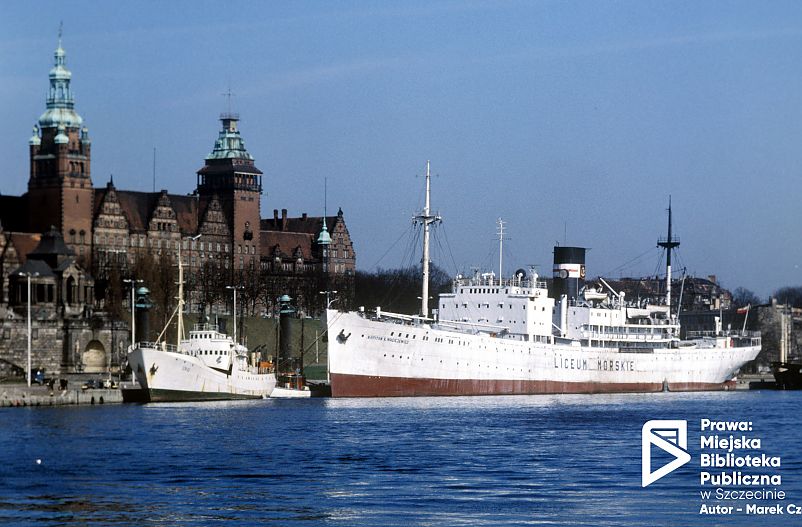 „SS Kapitan K. Maciejewicz” został zbudowany w 1929 r. w stoczni w Bremie dla jednego z francuskich armatorów. Trzykrotnie przybierał inną nazwę przy okazji zmieniając także swoją funkcję. W końcu w 1973 roku stał się siedzibą Liceum Morskiego w Szczecinie. Według oficjalnych danych na statku znajdowało się siedem izb lekcyjnych, aula, sala kinowa, trzy pomieszczenia warsztatowe i kuchnia z trzema mesami. W 57 kabinach mogło mieszkać 247 uczniów, nie licząc pomieszczeń załogowych i administracyjnych. Dlaczego szkoła mieściła się na statku ? Odpowiedź na to pytanie jest dość prozaiczna – nie było odpowiedniego budynku dla takiej szkoły w chwili kiedy powstawała. Po ośmiu latach tej romantyczno – pedagogicznej przygody liceum zostało w 1982 roku przeniesiona do Polic. Koszty jego działalności na statku były zbyt duże. Statek zezłomowano w Szwecji. Ocalał tylko… maszt – 30 tonowa konstrukcja o wysokości 30 metrów. Najpierw został on w 1990 roku (jako pomnik) ustawiony w pasie zieleni rozdzielającym jezdnie Trasy Zamkowej, na wlocie – wylocie do Szczecina, naprzeciwko dzisiejszego Placu Solidarności. W 2013 roku postanowiono go poddać konserwacji. Został więc zdemontowany. A potem wybuchła w mieście gorąca dyskusja i toczono zażarte spory o to czy, kiedy i gdzie maszt zostanie ponownie postawiony. Po pięciu latach znaleziono nową lokalizację – został przeniesiony na Łasztownię. Co też nie wszystkim przypadło do gustu. Dziś maszt z „Maciejewicza” można podziwiać naprzeciwko budynku La Stadii.