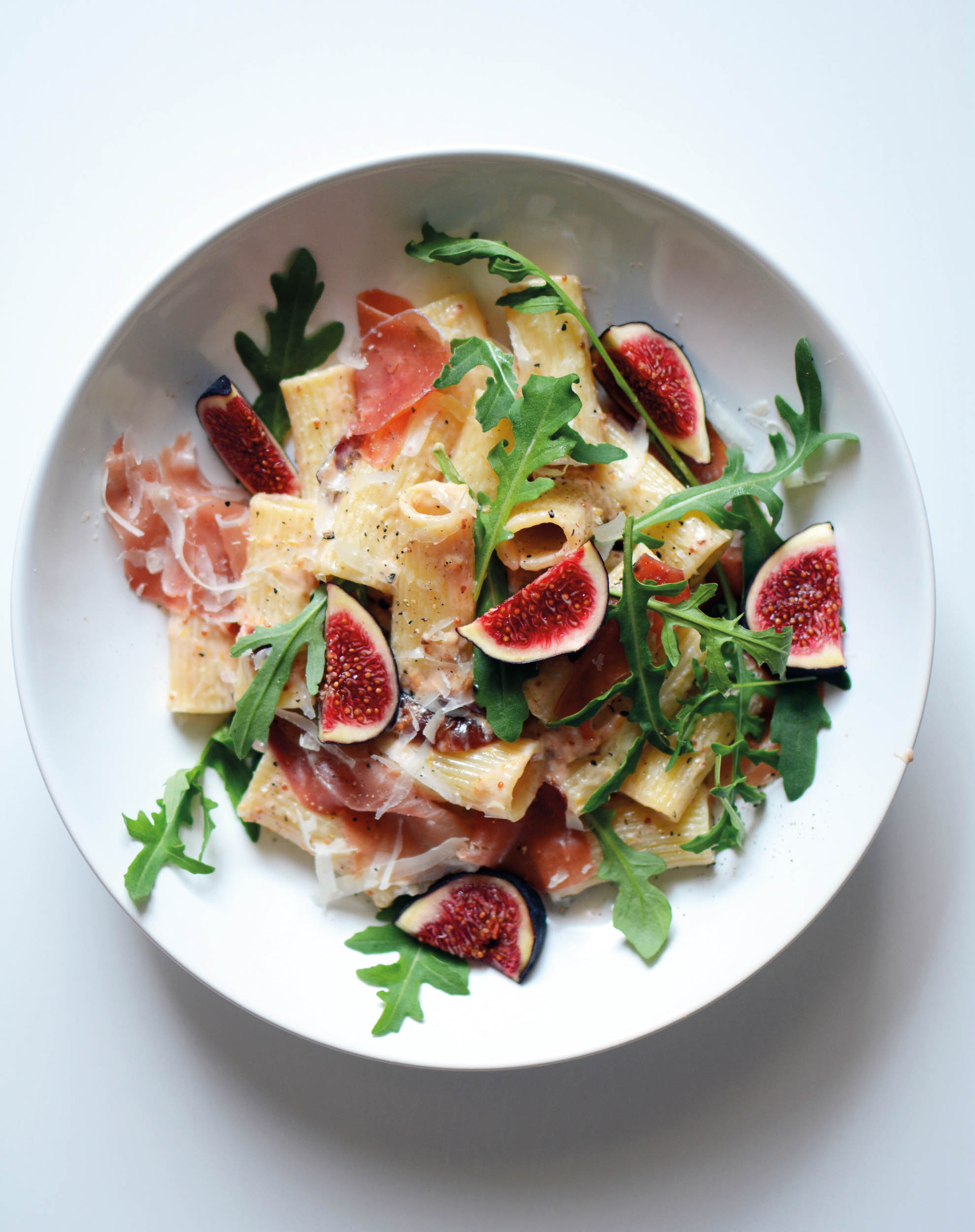 Na rozgrzaną patelnię wlejcie oliwę, dodajcie masło, wrzućcie pokrojone w plastry figi. Podsmażcie do zrumienienia, ok. 2 minuty, dodajcie śmietanę i sok z cytryny, zmniejszcie ogień. Gotujcie ok. 4 minuty, aż figi zaczną się rozpadać, a sos gęstnieć. Posólcie i popieprzcie do smaku. W międzyczasie ugotujcie makaron wg przepisu na opakowaniu. Odcedźcie makaron, dodajcie go do sosu, wymieszajcie. Wyłóżcie na talerze. Dodajcie rukolę, pokrojone, świeże figi, prosciutto i parmezan.